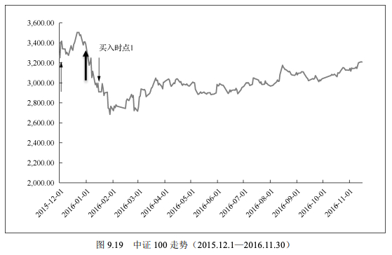 我们再来看一下“下跌-震荡”市场二者收益率情况的比较。从走势图中,我们看到,中证100在这段区间内先经历了一段快速下跌过程,从2015年12月1日的3252点下跌至2750点左右,跌幅最大达到17%,此后,从2016年2月开始直到11月,中证100一直在3000点附近震荡徘徊,在2016年11月15日,回到3209点,区间累计跌幅为1.32%,如图9.19所示。