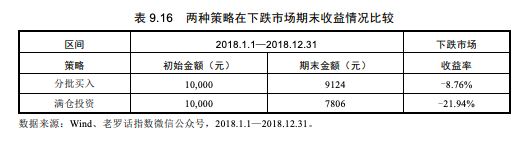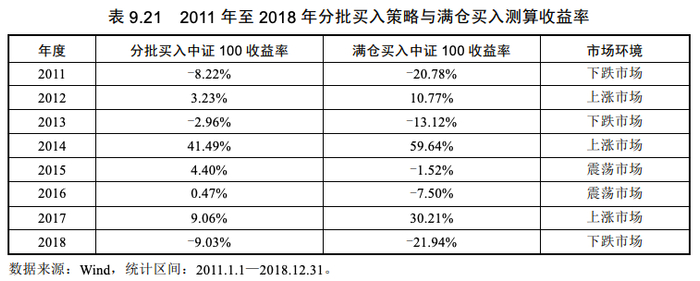 表9.21总结了2011年至2018年两种投资方式分别买入中证100指数的收益率情况。可以看出,在这8年中,分批买入策略在下跌市场和震荡市场中的收益率情况都好于满仓投资策略,而在上涨市场环境中,满仓策略收益率更高。