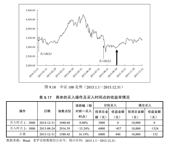 我们以2015年为例,当年中证100指数先呈现上涨趋势,但总体上以震荡行情为主,2015年累计跌幅为1.52%。采用分批买入策略,我们在2014年12月31日第一次投入3000元,至2015年8月24日,累计跌幅达到15.24%,触及下跌点,加仓30%,此后未触及下跌点,因此分批买入共投资6000元,其余4000元为现金资产,如图9.18所示。到2015年12月31日,收益率为4.40%。而采取满仓投资策略,则会亏损1.52%,如表9.17及表9.18所示。