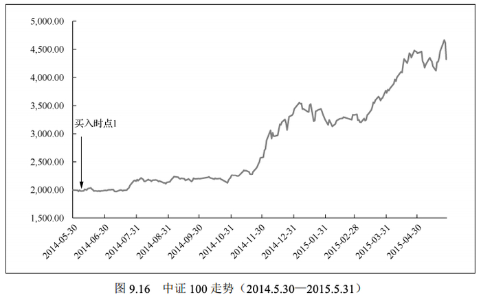 我们选取2014年5月30日至2015年5月31日这一区间,在这一段时间范围内,中证100指数以上涨为主,涨幅高达115.82%,由最初的1997.90点上涨至4311.77点,如图9.16所示。