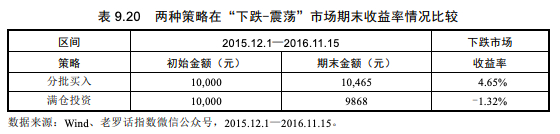 震荡市场升跌不定,分批买入策略在市场下跌的时候能够进行低成本吸纳,分摊成本,在较低点的时候能够领先满仓买入,获得更高的收益率,如表9.20所示。
