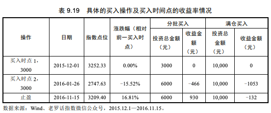 如果我们采用满仓投资的策略,那么在11月15日止盈的时候,累计跌幅为1.32%,亏损131.98元。而如果我们采用分批买入的策略,在2015年12月1日,我们买入3000元,则在2016年1月26日首次触及下跌点的时候加仓30%,此后未触及下跌点,因此总投入金额为6000元,其余4000元为现金资产。按照上述操作方法,到止盈时,投资收率益可以到达9.30%,如表9.19所示。