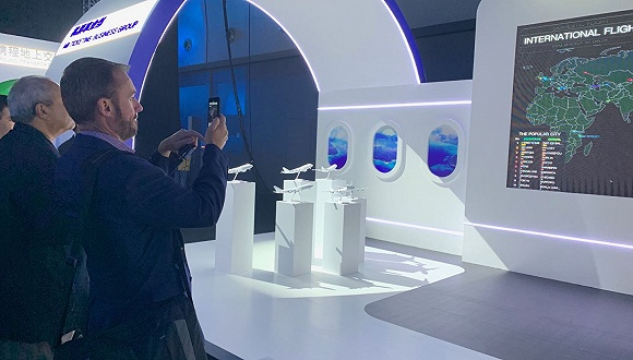 携程20周年峰会上,参会的外国友商在携程的全球实时航班轨迹图前拍照