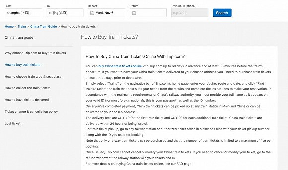 Trip.com上关于外国人如何在中国乘坐火车的说明。这些解说告诉外国旅客如何在中国购买火车票,中国的火车有哪些类型,座位等级有什么不同,如何取票、快递送票、退改签等 图片来源 Trip.com