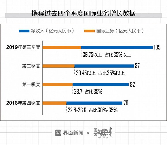 携程过去四个季度的国际业务增长情况 数据来源;携程财报
