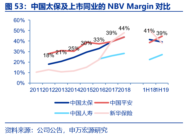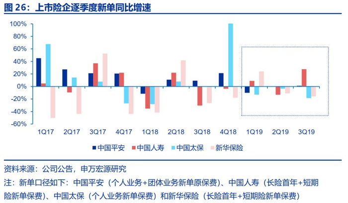 2019年以来太保寿险新单整体承压。9M19,从累计数据来看,中国平安(个人业务+团体业务新单原保费)、中国人寿(长险首年+短期险新单保费)、中国太保(个人业务新单保费)和新华保险(长险首年+短期险新单保费)合计实现新单保费3489.92亿元,同比增长-0.4%(1H19为-2.3%),其中平安、国寿、太保和新华新单口径同比增速分别为-4.7%、6.5%、-12.3%和-0.5%。3Q19,从单季同比数据来看,新单口径合计单季同比增速为6.1%(2Q19为-6.9%),其中平安、国寿、太保和新华新单口径同比增速分别为1.1%、27.6%、-18.5%和-15.8%。太保寿险新单增长压力较大主要系:1.去年同期公司销售规模型产品基数较高(太保寿险公司有每年8月均有规模型产品的销售习惯,2019年规模型产品“鑫享福”较去年同期的“利赢年年”缺口接近10亿元,未来公司将逐步压缩价值率偏低的规模型产品的销售力度);2.期末代理人规模预计较中报小幅下滑至约78万人,一定程度上拖累新单增长。我们认为坚定认为,当前是公司寿险业务增长低点,在转型2.0阶段,公司将实施队伍升级、服务增值、科技赋能,打造新周期发展新动能,深蹲起跳,明年增长可期。