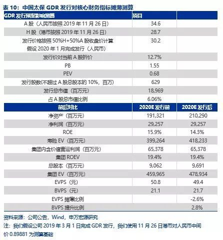 参照此前GDR发行价位于A/H股价中枢(首例GDR发行价格为每份20.5美元,对应14.1元人民币/股,对应A股折价为26.2%,对应H股溢价为19.4%),假设中国太保将按照50%H股股价和50%A股股价作为发行价测算,按照2019年11月26日收盘价,预计发行价为30.2元/股,对A股当前折价为12.7%,对应2019年PB约为1.55X,对应PEV约为0.68X,发行总市值为189.69亿元,对应当前A股总市值约为6.06%。