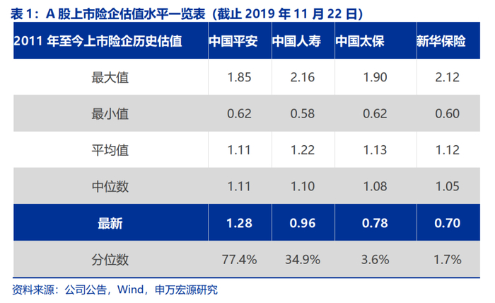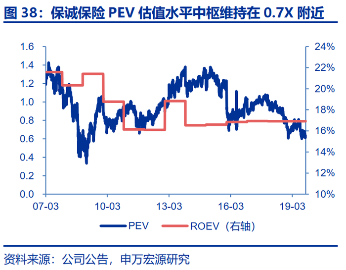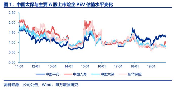 2017年底之前,中国太保与中国平安的PEV估值水平基本相近,2018年后中国平安估值水平开始逐步超越中国太保并开始享受估值溢价。2011年以来4家A股上市险企的PEV估值水平波动趋势基本保持一致,当前(2019年11月23日)中国平安、中国人寿、中国太保和新华保险PEV估值绝对水平分别为1.28X、0.96X、0.78X和0.70X,处于2011年以来历史分位数分别为77.4%、34.9%、3.6%和1.7%。由图1可知,太保PEV历史估值水平处于行业中枢,得益于稳健的保险和财务指标,公司估值波动性显著小于上市同业,但估值绝对水平2018年后逐步被中国平安拉大。