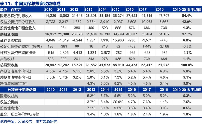 2010年至2018年,中国太保算术平均净投资收益率为5.0%,总投资收益率为5.1%(2013年至2018年净值增长率为5.9%)。从总投资收益构成来看,累计贡献占比如下:固定息投资利息收入(84.4%)、权益投资资产分红收入(12.0%)、投资性房地产租金收入(1.3%)、证券买卖收益(6.0%)、公允价值变动损益(-0.2%)、资产减值准备(-4.7%)和其他收益(1.1%)。净投资收益整体贡献占比高达97.7%,是公司长期总投资收益增长的基石。