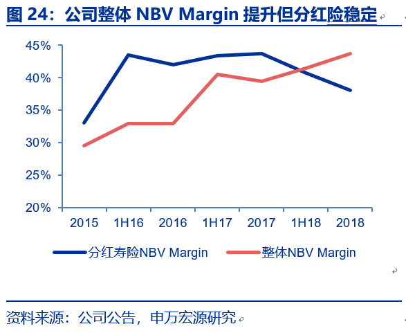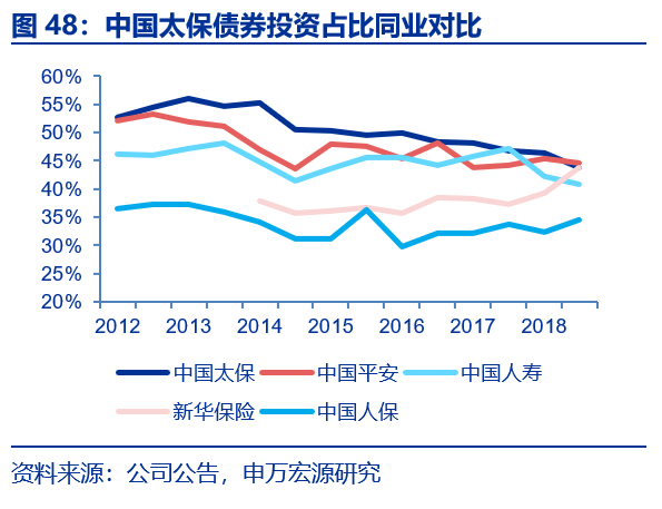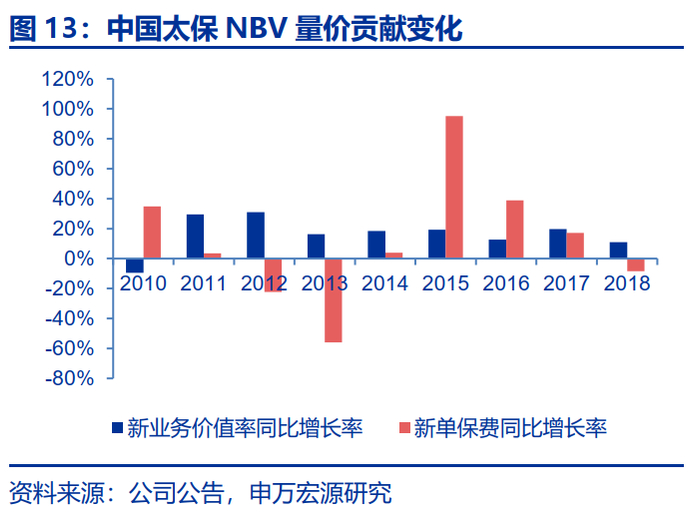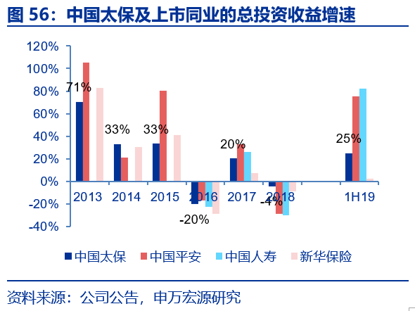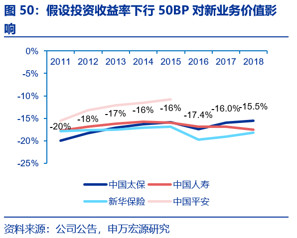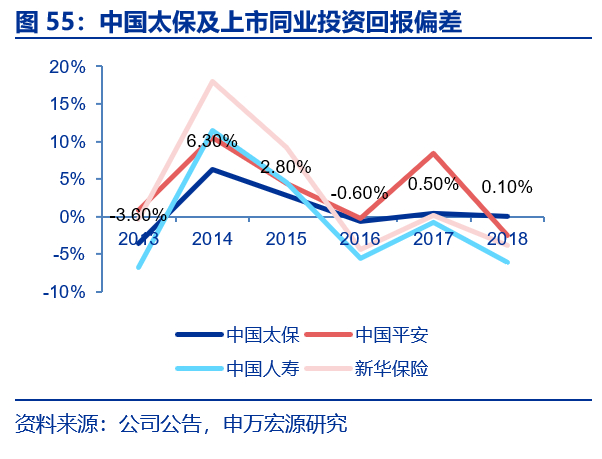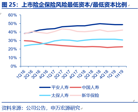 据偿二代下保险风险最低资本占量化风险最低资本的比例表明“保险姓保”的程度,这一比值越高表明寿险公司死差、病差和费差占比高。根据上市公司寿险子公司的偿付能力摘要,偿二代下市场风险最低资本占量化风险最低资本的比例表明寿险公司对利差的依赖度,我们发现,上市险企中太保人寿提升幅度最快,从1Q16的24%提升至2018年末的31.7%,截止2018年末平安人寿、国寿、太保寿和新华保险这一比值分别49.2%、21.9%、31.7%和40.6%。虽然保障型业务占比越高并不一定没有任何潜在风险(保障型业务也有利差风险、非分红险无损失吸收效应、死差病差风险等),但从资本效率角度来看,较储蓄型业务优势明显。