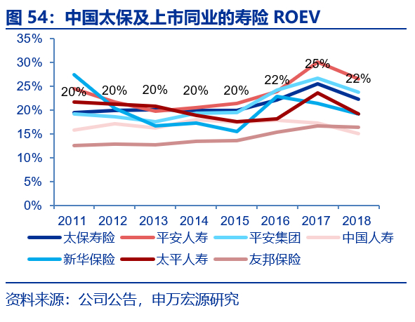 太保寿险的NBV Margin相对上市同业处于行业中位,而其历年来NBV Margin的增长幅度最为稳定。2017年之后,即转型2.0实施以来,中国太保的NBV Margin已经赶超中国平安,虽然在绝对数值上小于新华保险,但从稳定性来看要优于新华保险。中国太保2010年至2018年平均寿险ROEV为21.43%,处于行业较高位,仅次于平安人寿的23.8%,高于平安集团(21.19%),太平人寿(20.36%),新华保险(17.84%),中国人寿(16.63%)以及友邦保险(14.16%)。变化幅度方面,9年间中国太保的ROEV标准差为2.00%,要优于大部分同业,小于平安人寿(3.13%),平安集团(2.94%)以及新华保险(3.61%),稳定性较强。同时在资产端公司同业投资回报偏差绝对值和总投资收益的同比增速波动幅度均显著低于上市同业,我们认为公司稳定的财务指标将助力公司实现业绩和价值的稳定增长,符合外资审美偏好。