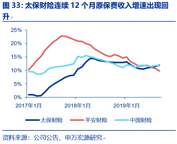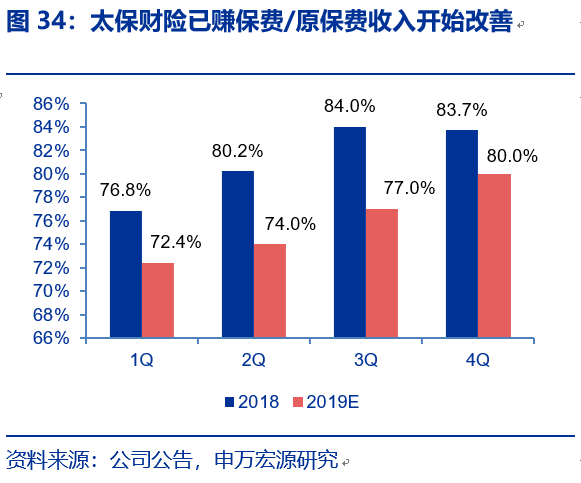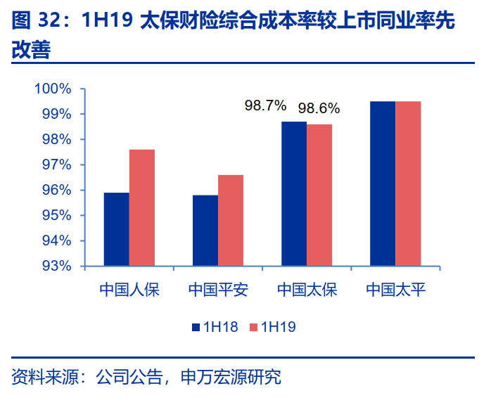 财险业务已赚保费率边际加速改善,预计四季度起将不再拖累综合成本率。9M19太保财险已赚保费/原保费收入比值为77.0%(1H19为74.0%,9M18为84.0%),4Q18车险费用率的下降带动首日获取费用大幅减少(对应未到期责任准备金增加)影响有望在今年四季度逐步出清。同时,历经2014年至2016年业务结构调整,2017年以来公司拟原保费收入增速逐步追赶上同业,截止2019年9月,太保财险、平安财险和人保财险的12个月滚动原保费收入的同比增速分别为11.9%、9.8%和11.7%。同时1H19太保财险综合成本率较上市同业率先改善。