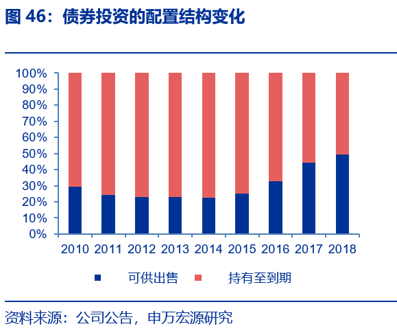 太保集团的固定收益类投资主要由债权投资、定期存款、债权投资计划等组成。其中债券投资占比最高(2010年至2018均值为62%),且相对稳定;定期存款比重逐年下降(从2010年的31%逐年下降至2018年的12.5%),公司增加了债券投资计划、理财产品和优先股等的非标资产的配置。其中债权投资分为可供出售和持有至到期类投资,2010年至2015年比重相对稳定,2015后随着债券到期收益率的下降,公司调整了持有至到期类投资占比,债券投资中可供出售金融资产的占比从2015年的24.1%提升至2018年的49.1%,增强了集团的投资灵活性。