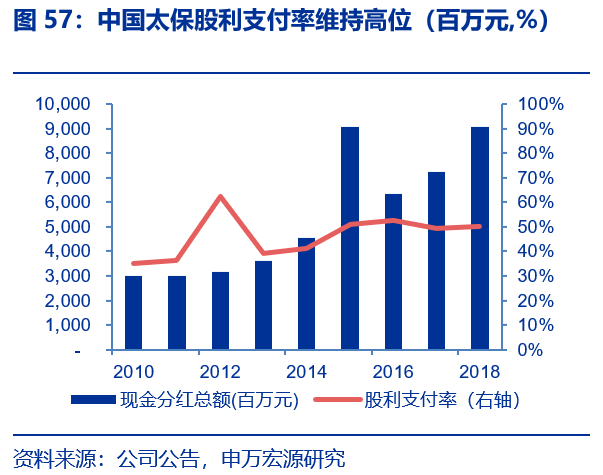 中国太保集团考核指标中分红总额是重要指标,以此实现股东与管理层利益的平衡。中国太保2010年至2018年净利润的CAGR达到9.76%,而同期现金红利的CAGR达14.77%,累计的股利支付率达46.9%,而同期国寿、平安和新华股利支付率分别为35.0%、24.8%和20.3%。稳定且处于高位的分红率在吸引长期机构投资者的同时,也倒逼公司聚焦主业,在投资端着眼于长期稳健。