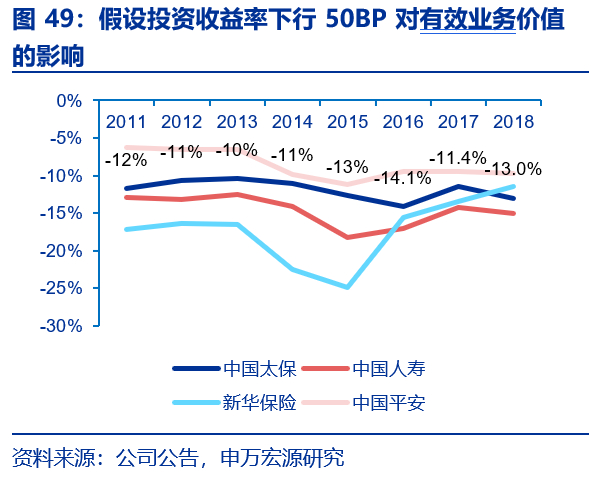 资产负债久期缺口较上市同业偏长,但得益于公司在分红险和保障型产品上的均衡布局以及产寿险业务的集团整体上市,公司的有效业务价值、新业务价值和税前利润对折现率的敏感性较同业差距并不大,并且近年来有逐步收缩的趋势。我国寿险公司的负债端久期往往显著高于资产端久期,因此从对净资产影响角度分析寿险公司整体受益于利率上行(利率上行期,资产端持有至到期债券再配置的投资收益率上行,负债端评估利率上行减少需要计提的准备金规模,虽然以资产端以公允价值计量的金融资产账面减值有所减少,但公司整体净资产规模保持向上)。当前中国太保资产负债久期大概在6.5年左右,负债久期在15-16年左右,久期缺口不到9年,在上市险企中处于偏高水平。(而同期上市同业中,中国平安最低仅为6.6年、新华和国寿均约为7年)。同时从价值口径分析,储蓄型产品价值比保障型产品利率更敏感:储蓄型产品价值主要来源于利差,保障型产品价值来自于利差和死差,储蓄型产品价值对利率更敏感;传统储蓄型产品比分红储蓄型产品利率更敏感:分红型产品可以通过降低客户收益,减少对利率的敏感性。太保寿险主力保障型产品“金佑”系列重疾险采用英式分红,2018年公司销售排名前五产品中有3款分红险。根据测算,我们发现在假设投资收益率下行50BP后,对太保寿险有效业务价值的冲击近三年分别为-17.4%、-16.0%和-15.5%,而国寿和新华2019年同期分别为17.5%和18.2%,甚至还略高于太保。在假设投资收益率下行50BP后,对太保寿险新业务价值的冲击近三年分别为-14.1%、-11.4%和-13.0%,而国寿和新华2019年同期分别为-15.1%和-11.4%,太保2018年略有提升预计和金佑系列替代产品金佑采用了传统险形式有关。得益于集团整体上市,根据报表附注和线形外推的假设,在折现率整体下行5个BP假设下,中国太保集团净利润受影响程度近三年分别为15.5%、14.9%和13.6%,而2019年同期平安、国寿和新华集团报表影响程度分别为2.0%、68.4%和26.5%。公司曾在2017年投资者开放日中表示“利率风险是长期寿险业务中最不确定、影响最大的风险, 采取不同的定价策略得出相同的保费,总体价值率水平比较接近。在高定价利率产品保费中客户的保证收益高,公司投资收益差虽低,但投资收益风险暴露程度接近;使用较低的定价利率,通过与客户分享收益、共担风险,降低风险暴露程度,仍然是较为稳妥的定价策略”。