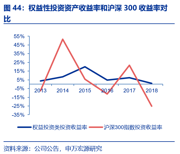 除2012年和2015年外,权益类投资资产贡献的投资收益比例相对于投资资产中权益类投资资产占比来说具有优势,即权益类投资资产贡献的投资收益比例略高于权益类投资资产按资产比例贡献的投资收益。2015年牛市期间权益类投资收益占比明显提升,其余年份相对稳定。太保集团的权益类投资收益率相对于沪深300指数来看,波动不明显,保持在一个相对稳定的水平,在牛市期间没有大幅度加仓,在熊市年份也没有出现权益类资产投资收益的大幅亏损,综合来看太保寿险2013年至2018年权益类投资资产的投资收益率为7.6%,而沪深300同期历年几何平均投资收益率为3.6%,公司权益投资能力强于大市。