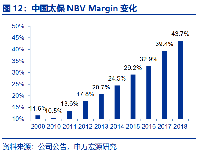 2009年以来,太保寿险的NBV持续增长。相较于2009年,公司2018年的NBV增长442.4%,CAGR为20.67%。其中,NBV Margin提升276.7%,而新单保费的增长幅度为44.0%。转型1.0以来太保寿险NBV的大幅增长的主要贡献来自NBV Margin水平的整体提高。NBV Margin从2009年的11.60% 提升至2018年的43.70%,且2010年后太保寿险NBV Margin逐年稳步提升。公司遵循“保险姓保”的行业发展规律,大力发展长期保障型业务。从新保构成来看,太保寿险长期保障型业务占比从2011年的10%提升至2016年的36%。从NBV构成来看,太保寿险长期保障型业务占比从2011年的43%提升至2016年的73%。