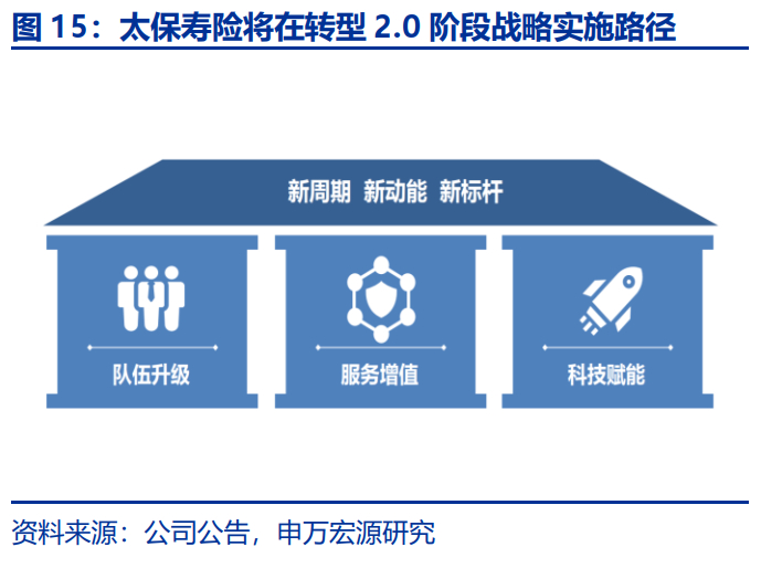 立足当下,太保寿险将全面推进转型2.0,努力成为新周期转型标杆。转型2.0阶段是1.0的延续和深化,公司从过去“聚焦营销、聚焦期缴”升级为“聚焦价值、聚焦队伍和聚焦赋能”。在转型2.0阶段,公司将实施队伍升级、服务增值、科技赋能,打造新周期发展新动能。太保寿险将在转型2.0阶段,加快打造三大新动能:推动营销队伍结构升级,以客户生态圈建设促进服务增值,强化全流程科技赋能,全面加快高质量发展。