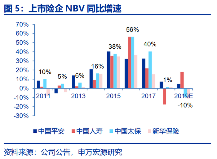 我们预计公司2019年至2020年新单保费收入的增速分别为-5.4%、10.7%和16.6%(我们预计到2021年公司月均代理人规模为83.0万人,人均产能提升至5644元/月/人,2018年分别为84.7万人和4595元/月/人),NBV Margin分别为41.2%、42.3%和43.1%,NBV增速为-9.9%、12.6%和21.1%)。得益于公司优质稳健的业务品质,我们预计公司未来3年寿险业务税前营运利润(测)同比增速为17.0%、17.6%和12.6%,寿险ROEV达19.5%、19.1%和19.4%。