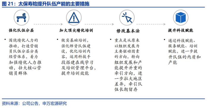 公司将追求提升核心人力的规模和占比(当前占比25%,未来三年达到40%)。核心人力主要具有以下特点:寻求职业发展的专职代理人;具有一定的管理或销售能力;认同行业,能长期稳定留存;以及收入稳定且持续地增长。公司保持3年以上人力,连续达成健康人力,目前占比25%,提供了60%的保费贡献。预计三年后该项比例能达到40%,未来公司将持续走健康人海战术。