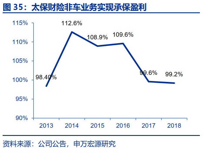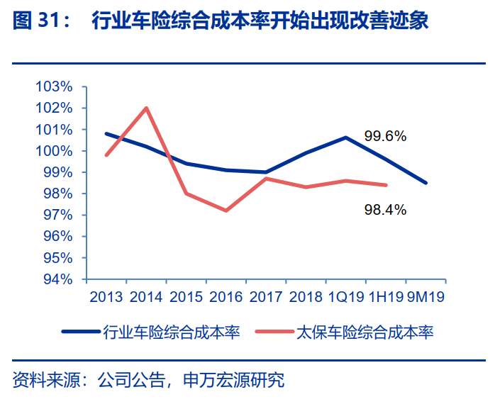 行业车险业务综合成本率持续边际改善,行业龙头有望率先复苏。就2019年前三季度来看,行业车险综合成本率为98.5%,较去年同期改善1.2个百分点,其中受益于报行合一执行和严监管的落地,综合费用率同比大幅下降5.1个百分点至38.0%,综合赔付率受NCD系数的影响上行3.9个百分点至60.4%。就全国范围来看,率先试点商车三次费改的地区中陕西、广西、青海三地均呈现综合费用率大幅下降,整体综合成本率稳中略降的趋势,其中综合费用率大幅分别大幅下行15.9、18.3、11.0个百分点至28.3%、35.0%和30.7%,综合赔付率分别上行11.8、9.8、6.7个百分点至65.7%、55.9%和56.0%,整体呈现30%费用率和70%赔付率的整体水平。全国26个地区综合成本率边际改善(广西、内蒙古和黑龙江改善最为明显),10个地区呈现恶化趋势。2015年后随着太保财险不断优化业务品质,车险综合成本率始终优于行业平均水平,我们预计随着车险行业拐点的到来,公司有望获得超越行业的承保利润率,带动ROE稳定提升。