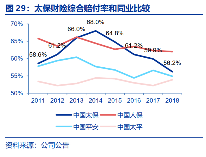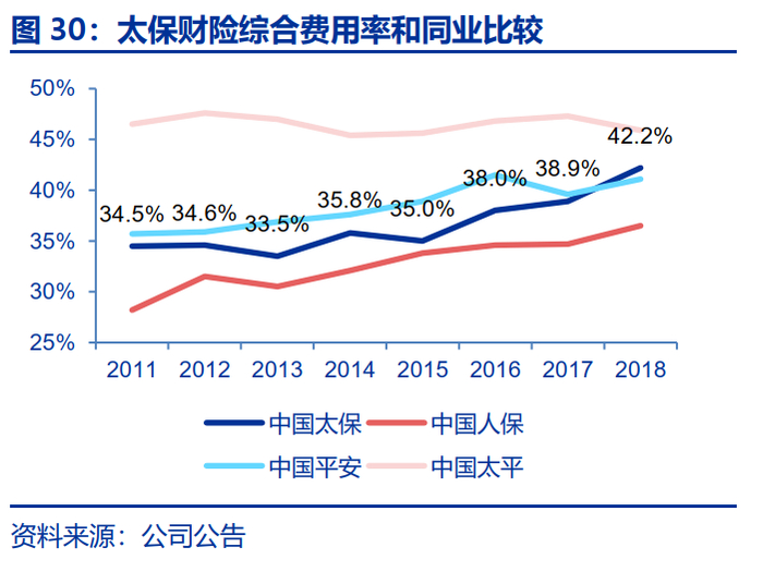 其中综合赔付率在2014年出现畸高点后呈现下降趋势,从2014年的68.0%下降至2018年的56.2%,公司在风险选择和理赔管控方面初见成效,但整体横向对比,仍高于其他上市同业。2011年以来上市险企的综合费用率普遍呈上升趋势,太保的综合费用率自2011年以来呈现明显上升趋势,从2011年的34.5%上升至2018年的42.2%。
