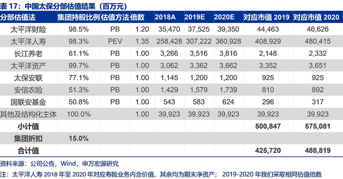 我们采用分部估值法对中国太保进行估值。其中我们对太保财险给予444.63亿元的价值评估,对应1.2倍PB,对太保寿险按照PEV-ROEV模型给予对利率敏感性调整前1.84倍PEV,但是根据前文分析(我们预计2019年至2021年公司总投资收益率分别为5.0%、4.7%和4.7%,因此我们按照敏感性分析假设线性外推给予30BP投资收益率假设下调,分别对应NBV和VIF下调7.8%和6.5%,对应调整未来ROEV和2019年当年度静态EV),得到经过调整的PEV估值为1.35倍,其余业务我们按照1倍PB估值,对集团我们采用15%折扣。具体结果如下,对应2019年我们给予目标市值为4257.20亿元(较当前收盘价有36.0%向上空间),对应2020年目标市值为4888.19亿元(对应2020年目标市值我们采用与2019年相同估值倍数),当前股价对应19-21年PEV分别仅为0.78X、0.68X和0.59X,考虑到当前公司估值极具吸引力,我们从增持评级上调至买入评级。