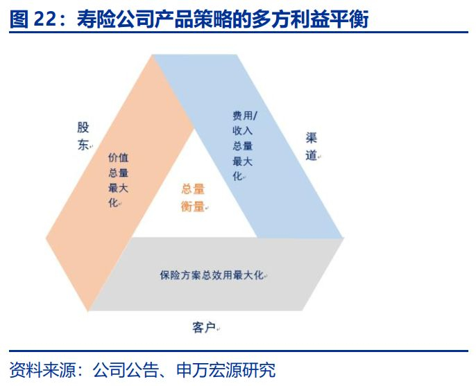 2016年以来行业加速回归保障本源,保障型产品对新单、价值和利润的贡献逐步提升,但是必须客观认识到的是由于从储蓄型产品向保障型产品切换过程中,件均保费降低是不争的事实(但同时也说明代理人质态仍有待提升,简单粗放型增员无法扭转行业颓势),因此确保高资产规模,拉长、拉高利差依然是产品的最大使命和唯一的选择,结合客户需求,产品战略的核心原则应为“储蓄拉动保障、死差服务利差”。在这个原则下,储蓄型强需求产品的目的,不是追求自身的价值率,而是带动弱需求的高价值产品销售。三大利益相关方转向总量衡量原则,即,股东追求价值总量最大化、渠道追求费用/收入总量最大化、客户追求保险方案总效用最大化。结合未来规模、价值率和需求程度,未来长期年金、终身寿险和长期健康险三足鼎立可期。