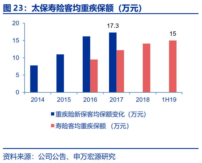 太保寿险始终强调新业务价值总额的稳定,而并非一味追求新业务价值率的持续攀升,而是持续追求客户、股东和管理层利益的多方平衡。2018年太保寿险销售排名前五的产品分别为金佑人生终身寿险(分红型)A款(2014版)、金佑人生终身寿险(分红型)A款(2017版)、幸福相伴(尊享型)两全保险、金诺人生重大疾病保险(2018版)东方红•满堂红年金保险(分红型),有一款产品是重疾险和两款终身寿险。而同期平安人寿分别为赢越人生年金保险(分红型)、尊宏人生两全保险(分红型)、平安福终身寿险、玺越人生(少儿版)年金保险(分红型)和玺越人生(成人版)年金保险(分红型)。公司坚持以价值为考核导向,坚持“保险姓保”,大力坚持长期储蓄型产品和长期保障型双轮驱动的发展理念,业务结构均衡属性在上市险企中处于前列,公司历年价值率的提升主要来自于产品结构的改善而非单个产品价值率的持续提升(2015年以来公司整体NBV Margin逐步提升,但是以金佑系列分红险为主保持稳定)。对代理人收入构成而言,储蓄型产品起到“托底”的关键作用、保障型产品则是“锦上添花”以完善客户风险保障体系。公司通过老客户加保和新客户布局实现寿险客均重疾保额从2016年9.5万元提升至2019年中期的15万元。