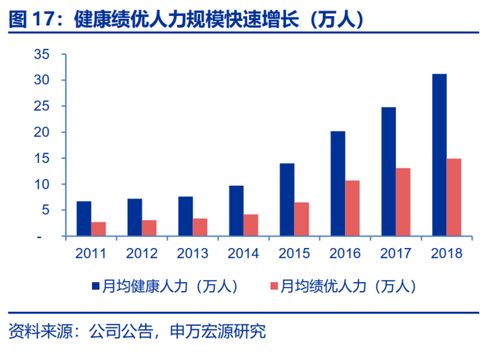 历经3年人力高增,2018年起公司保险营销员总人数小幅下降。公司月均代理人数量从2017年的87.4万人减少至2018年末的84.7万人,但是月均健康和月均绩优人力持续上升,从2011年的6.7万人和2.7万人上升至2018年的31.2万人和14.9万人。公司聚焦营销队伍质态的提升,健康和绩优人力规模占比不断提升,从2011年的22.9%和9.2%上升至2018年的36.8%和17.6%。