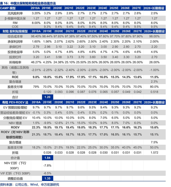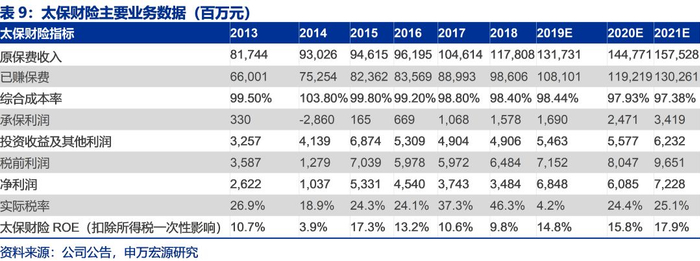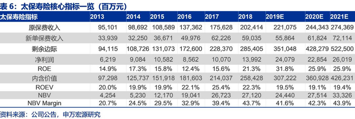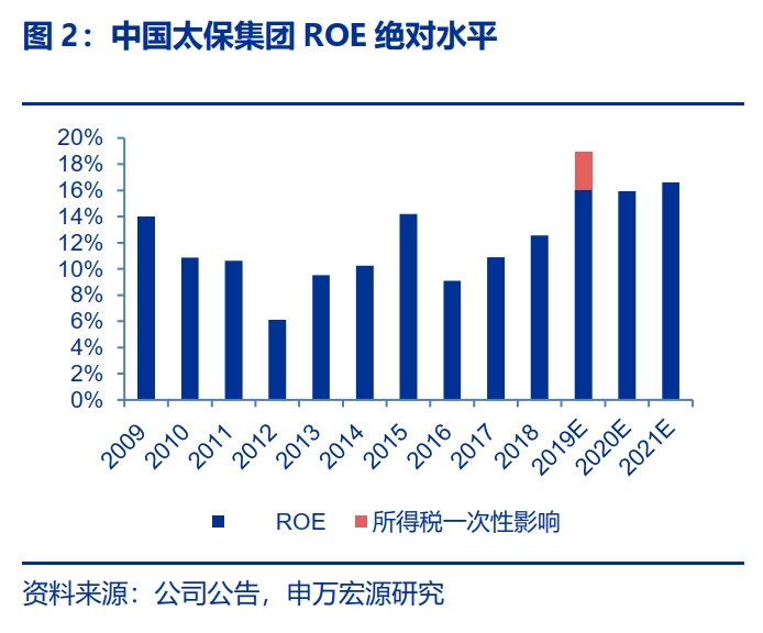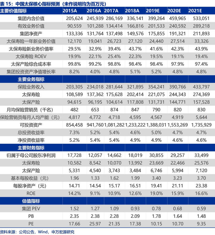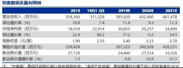 我们预计中国太保2019年至2021年归属于母公司股东净利润分别为308.55、292.57和334.99亿元(原预测为266.82、283.05和336.65亿元),同比增速分别为71.2%、-5.2%和14.5%(2019年因所得税新规一次性影响约49亿元,扣除后2019年净利润约为266.16亿元,同比增速为44.4%),集团内含价值分别为3992.64、4599.65和5330.51亿元,同比增速分别为18.8%、15.2%和15.9%,太保寿险一年新业务价值分别为244.4、275.14和333.26亿元,同比增速分别为-9.9%、12.6%和21.1%,太保寿险ROEV分别为19.5%、19.1%和19.4%,集团ROE分别为19.0%、15.9%和16.6%。