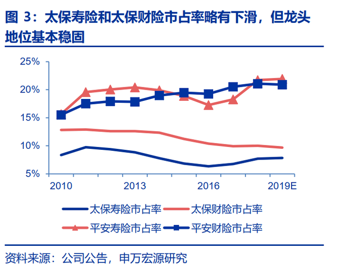 1.中国太保2016年至2018年ROE分别为9.1%、10.9%和12.6%,呈现逐年抬升趋势,2019年受益于所得税新规的一次性返还影响(约48亿元)ROE有望提升至19.0%,2020年至2021年分别为15.9%和16.6%,未来中枢有望稳定在16%的上方;2. 中国太保2010年至2018年净利润的CAGR达到9.76%,而同期现金红利的CAGR达14.77%,累计的股利支付率达46.9%,而同期国寿、平安和新华股利支付率分别为35.0%、24.8%和20.3%。稳定且处于高位的分红率在吸引长期机构投资者的同时,也倒逼公司聚焦主业,在投资端着眼于长期稳健;3.我们预计2019年太保寿险和太保财险市占率分别为7.8%和9.7%,均继续保持行业第三,并且在行业马太效应逐步强化的背景下,公司未来市占率有望进一步提升,2018年以来产险业务市占率已有明显企稳回升的迹象。