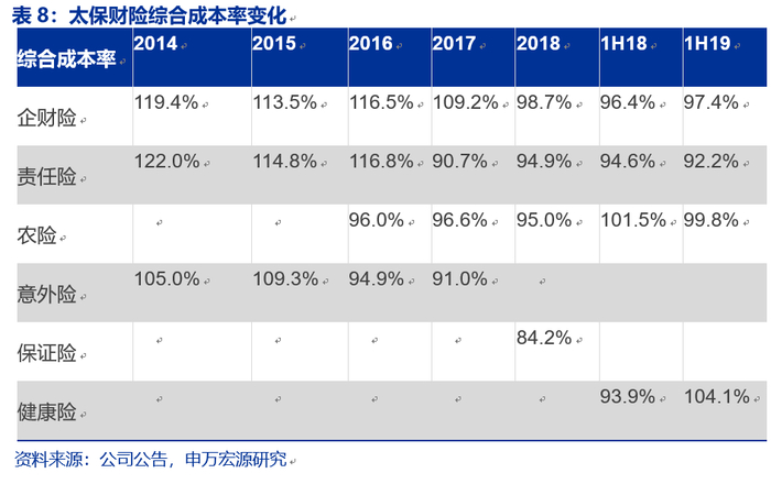 太保财险的综合成本率2011年至2018年分别为93.1%、95.8%、99.5%、103.8%、99.8%、99.2%、98.8%和98.4%,均值为98.6%,和同业相比相对较高,但呈现逐年改善的趋势。其中2014年为太保财险成立6年来首次出现承保亏损,产险的前五大险种均承保亏损,综合成本率达到103.8%,主要系:1.品质相对较低(包括赔付率较高)的车险业务占比有所提高,拉高了整体赔付额;2.市场竞争趋于激烈,令保险公司费率持续走低,拉低了整体保费充足度;3.2014年灾害发生频率较高,增加了理赔额;4.公司在发展策略、风险选择、理赔管控等经营管理方面有所偏差(公司局部区域业务部门的经营思路有所偏差,更看重市场份额与规模效应,放松了业务质量审核)。转型1.0以来,公司产险保费规模逐步增加,2015年以来车险收入大幅提高,推动产险业务实现盈利,综合成本率自2015年开始逐年下降,成本得到有效控制。