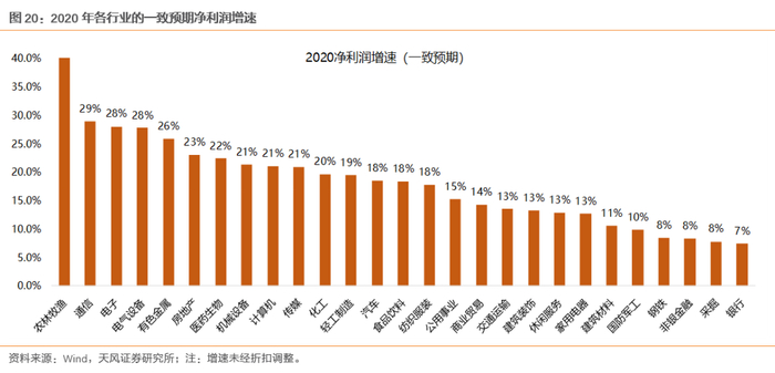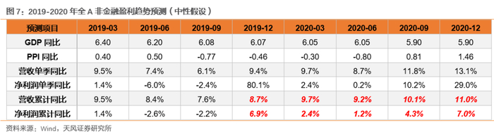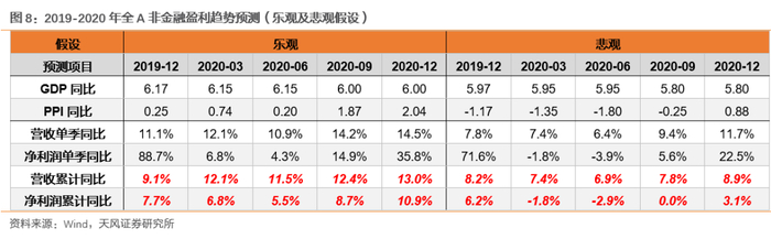 中性假设下,各板块和行业2020年净利润增速分别为:全A(5.4%)、全A非金融(10.8%)、主板(3.7%)、中小板(13.7%)、创业板(22.5%);创业板指(24.6%)、中小板指(13.5%)、沪深300(5.1%)。