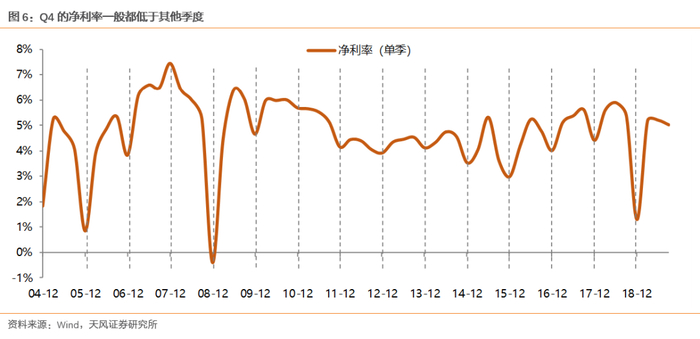 第三步,全A非金融单季净利率预测。通过PPI价格指数的走势来预测净利率变动。每年第四季度的净利率变动比较大,需进行微调,特别是近两年。2005年至今,Q1/Q2/Q3/Q4的平均净利率分别为4.99%、5.38%、5.04%和3.57%,Q4的净利率平均要比其他季度低1.40%,见图表8。18Q4由于大量资产减值损失的存在,当季净利率比18Q1净利率低4.33%。往前看,19年和20年的减值风险依然存在,但大概率会好于18年,因此,我们在模型结果的基础上将Q4的净利率进行微调。
