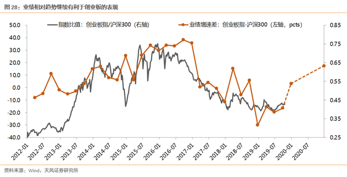 在这种情况下,如何进行应对?指数之间的相对走势与指数盈利的相对趋势是密切相关的,这也是我们一直以来强调的观点。在新的科技周期下,明年头部科技股的盈利继续得到支撑,相对业绩趋势支撑创业板指明年继续占优,但同时沪深300的业绩仍然比较稳健。因此,预计市场不会出现极端的风格分化,2020年“少部分公司”的牛市大概率将继续演绎,以创业板指所代表的科技板块将是超额收益的核心,同时消费公司长期依然值得重视,但2020年需要降低预期回报的目标。
