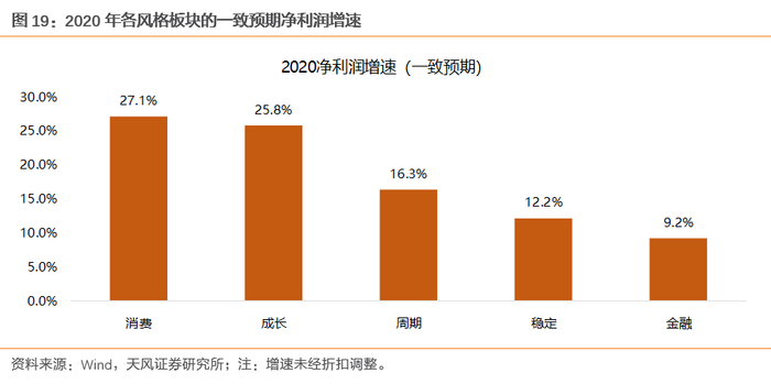 一致预期方法还可进一步推算风格板块和行业板块的净利润增速。如下方两张图所示。图中显示净利润增速未经折扣调整(行业的预测准确度波动较大)。