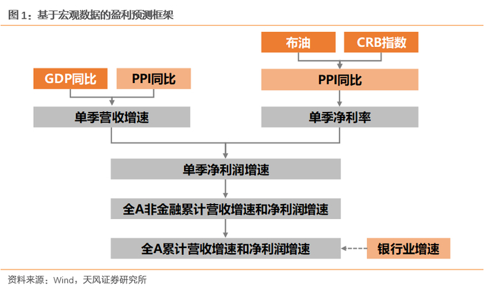 从宏观角度出发的预测方法,顾名思义是从宏观经济的核心变量入手,如GDP、PPI等,通过变量回归预测企业营业收入和盈利能力,关键在于宏观核心因子的预测以及预测模型的建立。这种方法对于与宏观经济相关性较大的板块或指数的适用性较强。一般来说,可用来预测全A、全A非金融、沪深300等板块或指数的盈利。