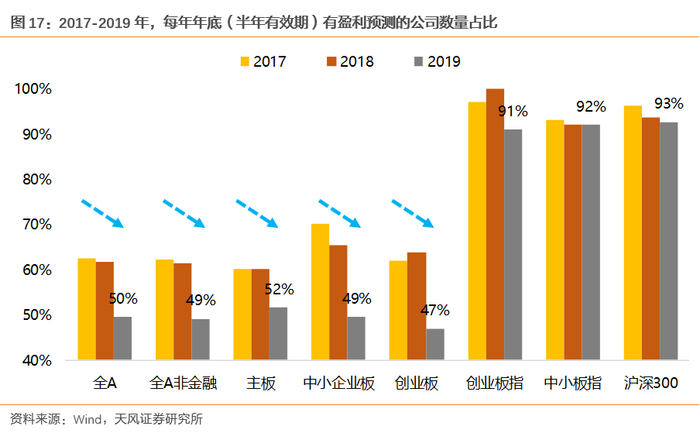 近两年有盈利预测的公司数量占比持续下滑,特别是2019年,占比仅一半。全部A股近半年有盈利预测(2020年)的公司数量仅占一半,创业板和中小板比例不到一半,但指数的预测数量比例均在90%以上。这也侧面反应了尾部个股的关注程度逐步下滑,市场投资偏好快速集中于以指数为代表的头部公司。
