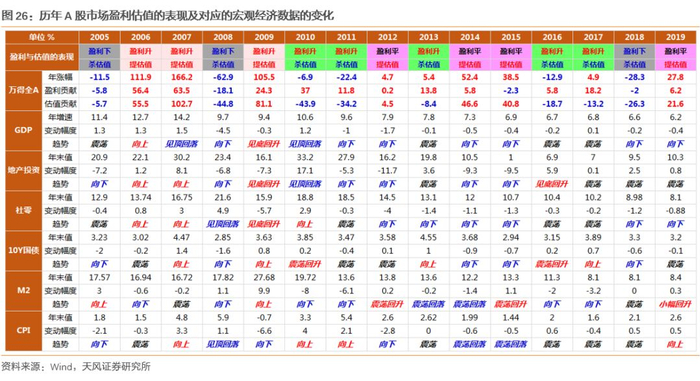 对于这一点,可从历年的盈利和估值对市场涨跌的驱动来验证。提估值的年份,均出现在经济大幅回升(06年和09年)或流动性较宽松(12、15和19年)的年份。而随后估值能否继续得到提升,取决于盈利是否大幅回升(超预期,如07年)。但事实上,更多的时候,紧接着的阶段表现为:盈利升、杀估值(如10、13和16年),对应的市场流动性表现为边际变弱(M2增速向下)。