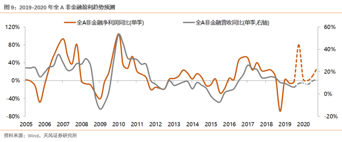 2020年,GDP代表的量小幅回落以及PPI代表的价企稳回升,这个趋势相对明确。相应地,工业企业的盈利可能表现为:营收增速仍有下滑,但净利润增速有所企稳。而在第一部分我们分析到,底部拐点非金融A股通常比基于宏观数据的预测结果提前一个季度。