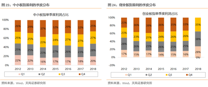 以创业板指为例:盈利增速采用季度分布法及不同资产减值情形测算。由于创业板指12-17年的利润分布较稳定,而18年受商誉减值等影响较大。我们根据前三季度的净利润水平以及历史的季度净利润分布,推算全年的盈利增速。考虑到资产减值的影响,具体分为三种情形来讨论。