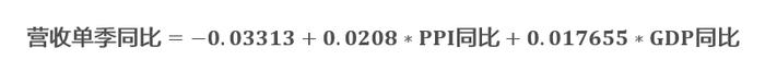 第二步,全A非金融单季营收增速预测。收入增速反应的是需求的变化,PPI同比和GDP同比分别代表了价和量的变化,通过PPI同比、GDP同比测算营收增速,模型的历史回归解释程度达80%。