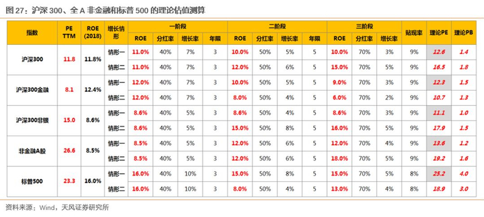 其次,从目前指数盈利水平所隐含的理论估值水平,来看当前指数是否还有进一步提估值的空间。我们通过三阶段增长模型对当前核心指数的估值做一个理论测算。