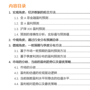 中观预测方法,简单来说是通过全部A股或非金融A股中各行业的营收分布和净利润分布比例,以及各行业的营收增速和净利润增速,来预测总体的情况。指数的预测则是通过指数中行业的权重来预测。