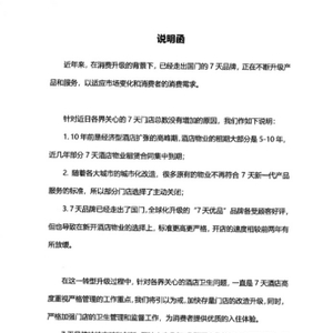11月18日,7天酒店针对媒体报道其门店大量关闭与卫生问题频发的问题在其官方微博上发布了说明函,其中关于频发的卫生问题,说明函提出,7天酒店将引以为戒,加快存量门店改造升级,严格加强门店的卫生管理和监督工作。