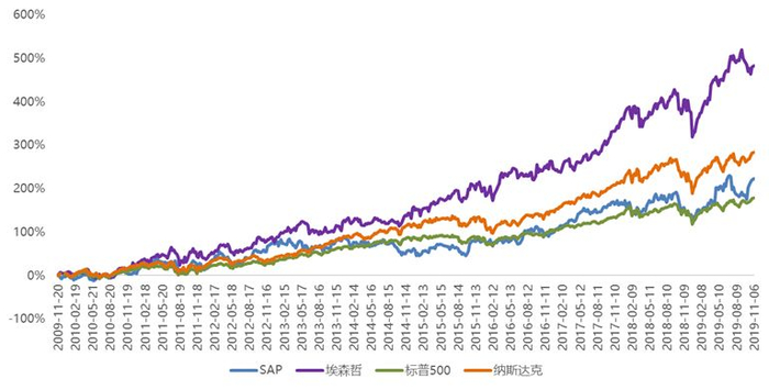 简单比较近十年来埃森哲的股价走势,以及软件厂商老大哥SAP、美股主流指数的涨跌幅可以看出,投资埃森哲的股票有明显的超额收益,不仅仅领先软件厂商,同时还领先于主流指数。