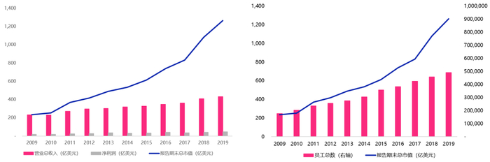 分析近十年来埃森哲的营业收入、净利润、员工总数与总市值的关系,我们发现,单位营收对应的市值(PS),单位净利润对应的市值(PE),与单位员工对应的市值三个指标都在上升。