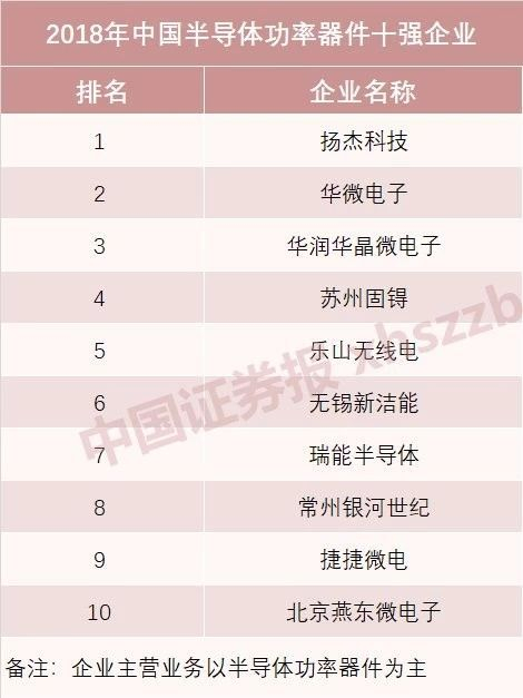 中国半导体行业协会今年5月发布了2018年中国十大半导体功率器件企业。扬杰科技、华微电子、苏州固锝、捷捷微电这四家A股公司跻身前十强。