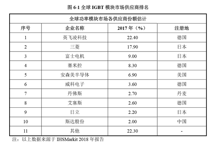 IHS Markit 2018年报告数据显示,在2017年度 IGBT 模块供应商全球市场份额排名中,英飞凌排名第一。